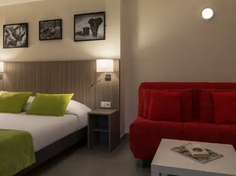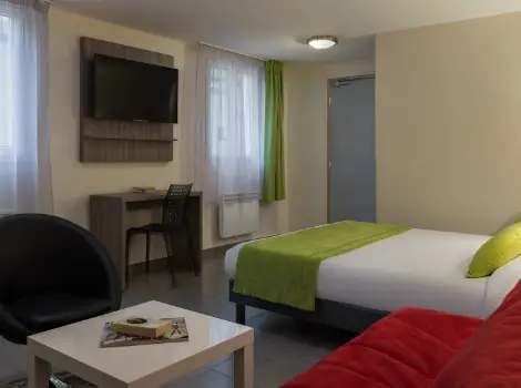Cette chambre peut accueillir confortablement jusqu’à 4 personnes. Que vous voyagiez en famille, entre ami(e)s ou pour affaires, elle offre un espace spacieux et fonctionnel, pensé pour le bien-être et la détente de chacun. Chaque détail est conçu pour rendre votre séjour agréable, avec un confort optimal et tout l’équipement nécessaire pour profiter pleinement de votre passage dans notre hôtel.